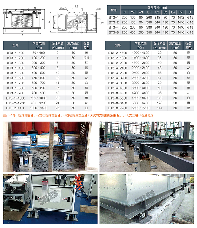 BT3型彈簧減振器撓度50mm,在額定載荷下固有頻率2.2Hz,阻尼比為0.05,工廠已對彈簧預緊壓縮60%,易于調節,是積極、消極減振的理想產品。