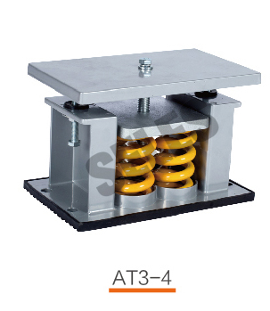 AT3型彈簧減振器是由高強度鋁合金外殼、彈簧及橡膠防滑墊組成。該產品為開敞式結構,具有靈活性大、穩定性好、固有頻率低、減振效果顯著等優點,安裝時可直接安放在設備底下,若動力設備撓力較大,可先調節重心,并將減振器底座固定孔用螺栓固定地基。